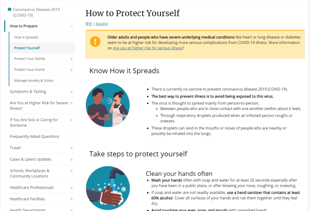 This webpage from the Centers for Disease Control and Prevention (CDC) is an excellent example of information that is presented clearly. There are visually interesting elements, the language used is accessible, and the information is well-organized.