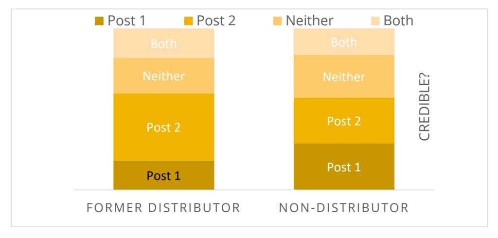 There was no overall consensus about which post was more credible, but separating the responses by distributor status revealed an interesting difference. Former distributors were more likely to view Post 2 as the more credible post, while those who had never been distributors roughly equally deemed Post 1, Post 2, and Neither post to be the most credible.