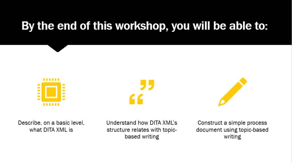 As part of my coursework requirements for Information Literacy Instruction, I designed a lesson plan for a workshop about topic-based writing and the basics of DITA XML. The workshop is designed for a professional context, ostensibly for use in orienting interns or new employees who will be doing some technical writing work without a lot of experience in this area.